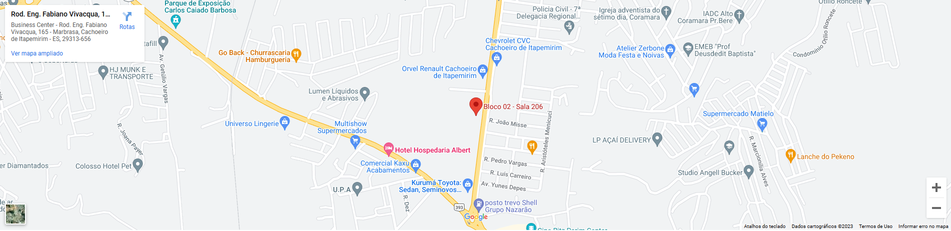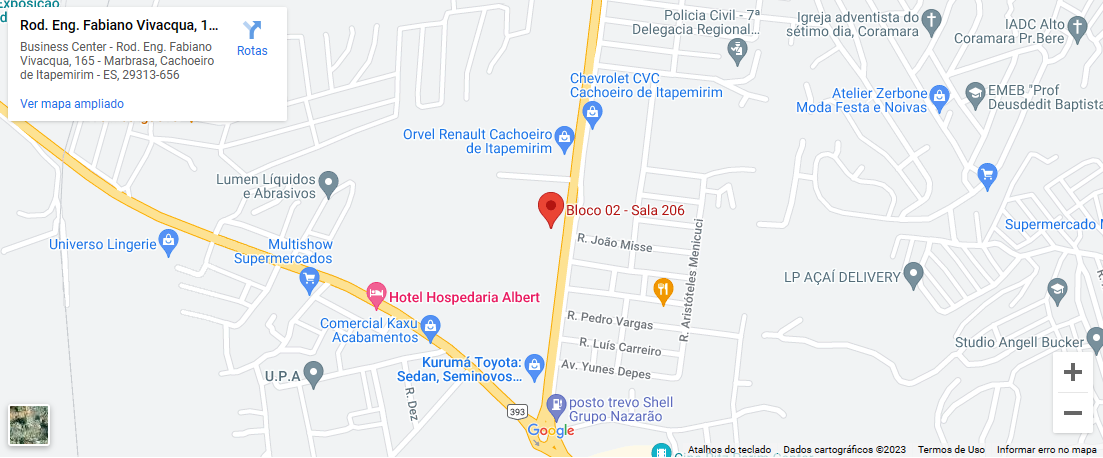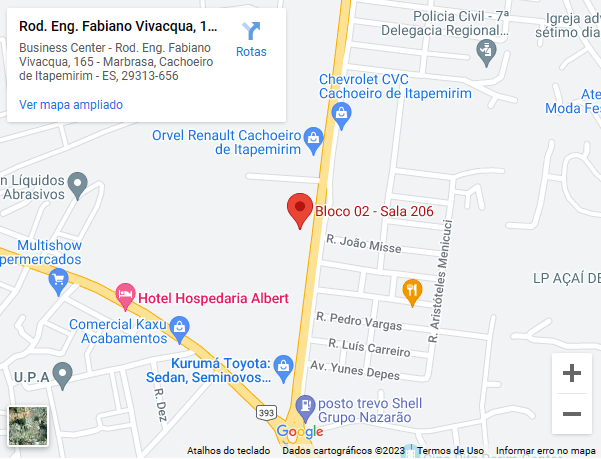 Rodovia Engenheiro Fabiano Vivácqua, 165, Bloco 02 – Sala 206 – Cachoeiro Business Center, Marbrasa Cachoeiro de Itapemirim – ES – CEP: 29313-656